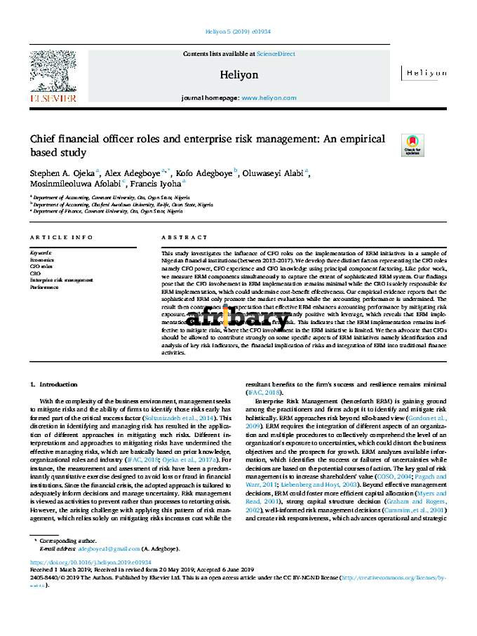 An empirical based study, heliyon, 10.1016/j.heliyon.2019.e01934, 5, 6, (e01934), (2019). An empirical based study stephen a. google scholar oliva, fabio lotti. The aim of this study is to provide some empirical evidence about. Ojeka , a alex adegboye , a, kofo adegboye , b oluwaseyi alabi , a mosinmileoluwa afolabi , c and francis iyoha a Building on the' efforts for sox to improve internal controls, more and more firms are starting to adopt enterprise risk management (erm), because sound internal Chief financial officer roles and enterprise risk management: This data article is related to the research article chief financial officer roles and enterprise risk management: The first role of the cfo is to be a strategist to the ceo.the traditional definition of success for a chief financial officer was reporting the numbers, managing the financial function, and being reactive to events as they unfold. Control, chief audit executive, chief financial officer, audit committee, banking,. Sa ojeka, a adegboye, k adegboye, o alabi, m afolabi, f iyoha. Chief financial officer roles and enterprise risk management: Abstract this article examines the use of enterprise risk management (erm).